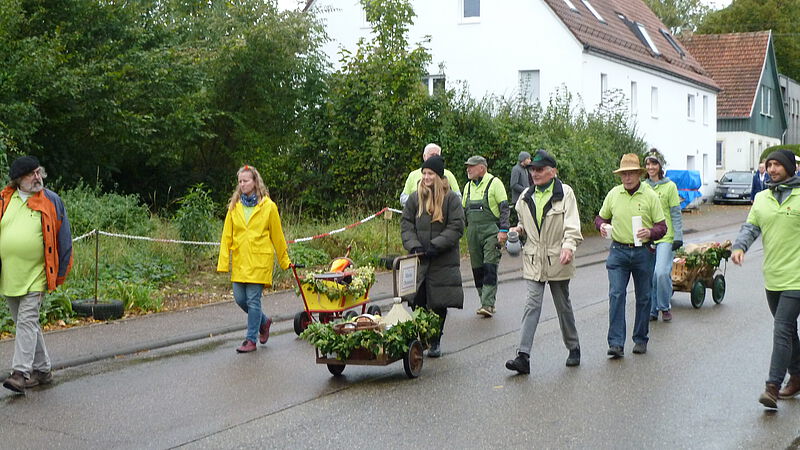 Viele Vereinsmitglieder waren beim Beitrag des OGV zum Festumzug 125-Jahre Musikverein beteiligt: Ein Festwagen mit Mostpresse, geschmückt mit Herbstastern, verschiedenen Gemüsen, Äpfeln, Weintrauben, Efeugirlanden und bunten informativen Stoff-Foto-Postern. OGV-Mitglieder schenkten den frischgepressten Most aus. Den Abschluss bildeten „Leiterwägele“ aus verschiedenen Jahrzehnten.
